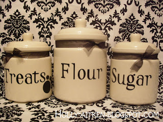 The big one was only $5.46 and the two small ones were $3.40 a piece. It was just TOO good to pass up! $12.26 for three really pretty porcelain canisters. The big one has a chip on it, but with a little Elmers Glue, you can't even tell. Plus, I will put it to the back anyway. No Sweat!